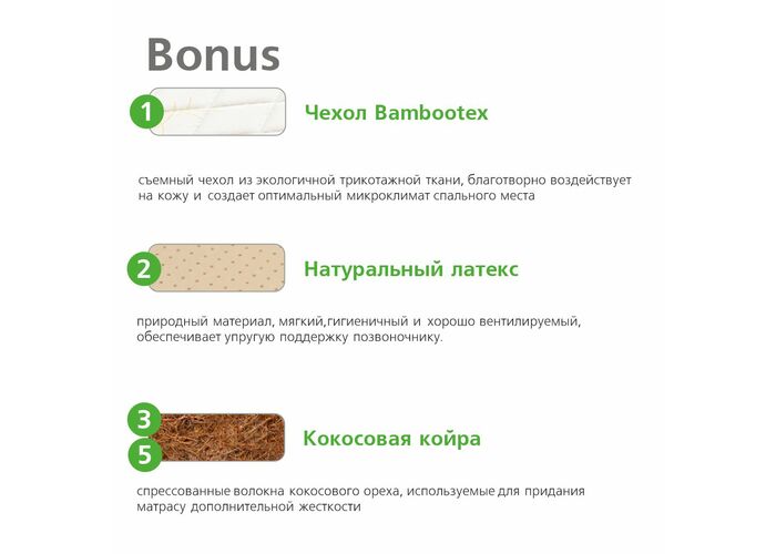 Натуральный материал, получаемый из сока каучукового дерева. Обладает такими уникальными свойствами, как гипоаллергенность, гигиеничность, вентилируемость, долговечность и обеспечивает упругую поддержку позвоночнику.