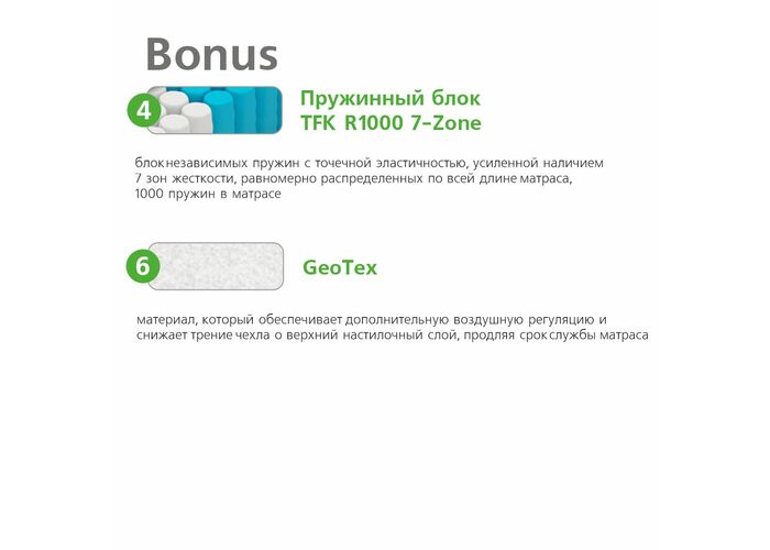 Блок независимых пружин TFK R1000 7-Zone (каждая пружина в отдельном чехле из спанбонда) и рассчитана на определённую нагрузку для точечной поддержки. Это достигается использованием пружин разной жесткости, что дает заметное улучшение ортопедических свойств. Оптимизирует давление и наилучшим образом осуществляет функциональную поддержку позвоночника и обеспечивает индивидуальную жесткость для каждой зоны тела человека, что способствует хорошему сну и отдыху. Плотность – 256 пружин на м. кв.