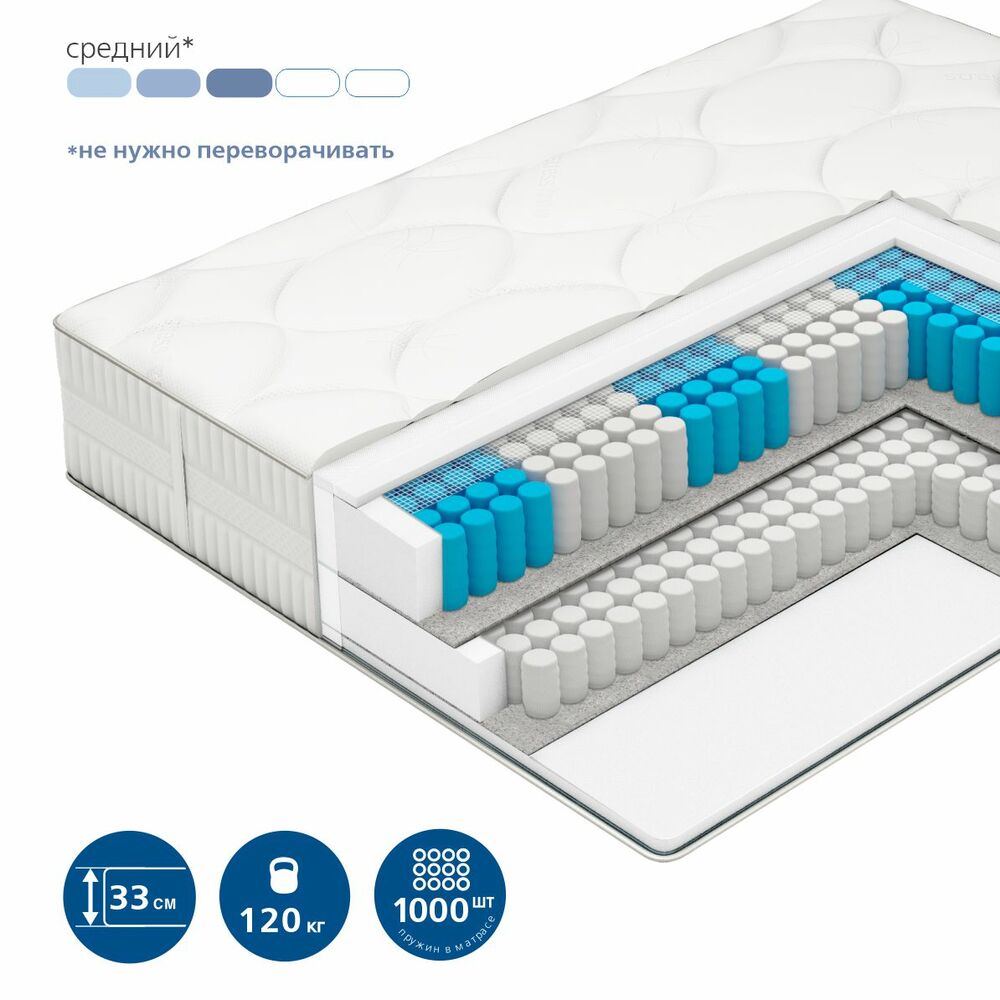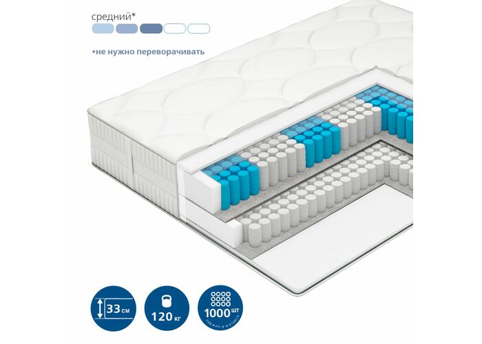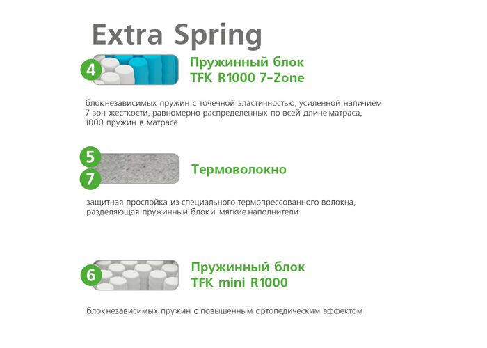 Блок независимых пружин TFK R1000 7-Zone (каждая пружина в отдельном чехле из спанбонда) и рассчитана на определённую нагрузку для точечной поддержки. Это достигается использованием пружин разной жесткости, что дает заметное улучшение ортопедических свойств. Оптимизирует давление и наилучшим образом осуществляет функциональную поддержку позвоночника и обеспечивает индивидуальную жесткость для каждой зоны тела человека, что способствует хорошему сну и отдыху. Плотность – 256 пружин на м. кв.