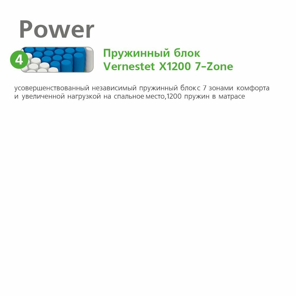 Блок независимых пружин Vernestet X1200 7-Zone (каждая пружина в отдельном чехле из спанбонда) плотностью – 1200 пружин в двуспальном матрасе. Усовершенствованный независимый пружинный блок с 7 зонами комфорта и поддержки во время сна. Пружины расположены в виде пчелиных сот, что увеличивает плотность их размещения, повышая ортопедический эффект и допустимую нагрузку на спальное место. Диаметр пружины 60 мм.