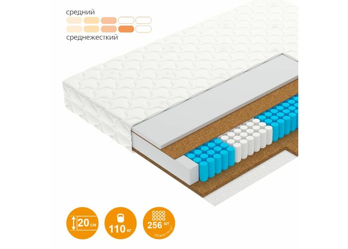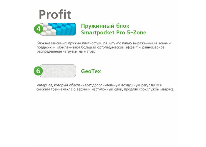 Блок независимых пружин Smartpocket Pro 5-Zone (каждая пружина в отдельном чехле из спанбонда) и рассчитана на определённую нагрузку для точечной поддержки. Это достигается использованием пружин разной жесткости, что дает заметное улучшение ортопедических свойств. Оптимизирует давление и наилучшим образом осуществляет функциональную поддержку позвоночника и обеспечивает индивидуальную жесткость для каждой зоны тела человека, что способствует хорошему сну и отдыху. Плотность – 256 пружин на м. кв.