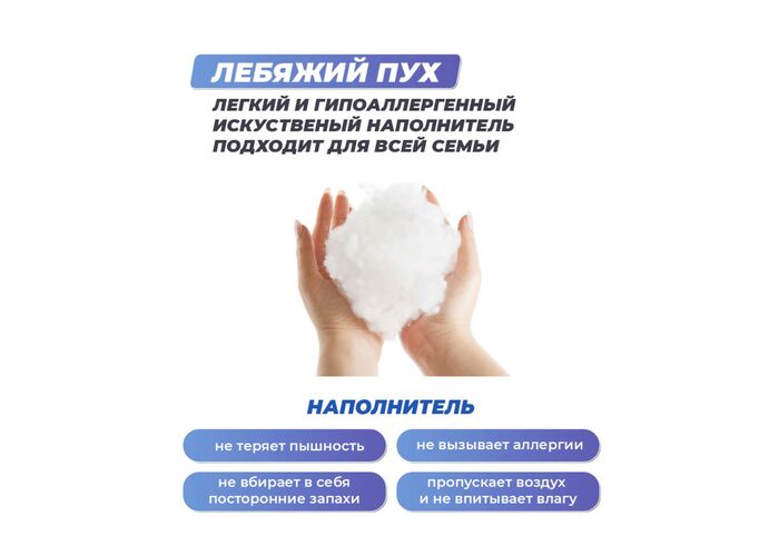 Искусственный лебяжий пух является гипоаллергенным, хорошо восстанавливает исходную форму и обеспечивает легкость в уходе.