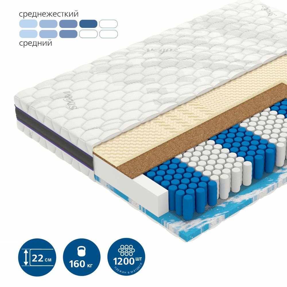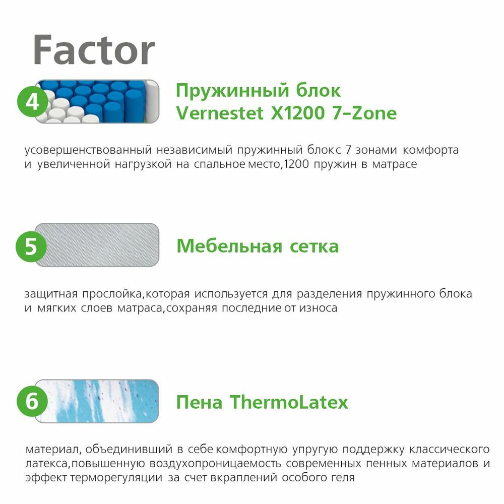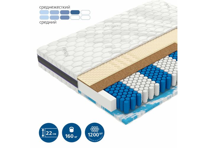 Блок независимых пружин Vernestet X1200 7-Zone (каждая пружина в отдельном чехле из спанбонда) плотностью – 1200 пружин в двуспальном матрасе. Усовершенствованный независимый пружинный блок с 7 зонами комфорта и поддержки во время сна. Пружины расположены в виде пчелиных сот, что увеличивает плотность их размещения, повышая ортопедический эффект и допустимую нагрузку на спальное место. Диаметр пружины 60 мм.