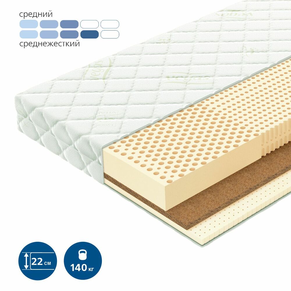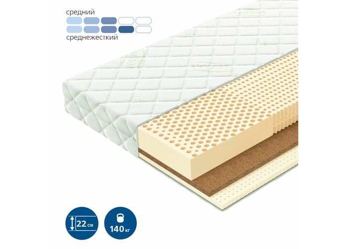 Цельный блок латекса с тремя поперечными зонами жесткости. Специальный набор отверстий различного диаметра и плотности расположения придает каждой из зон собственную жесткость. Таким образом достигается оптимальное распределение нагрузки и высокий ортопедический эффект.