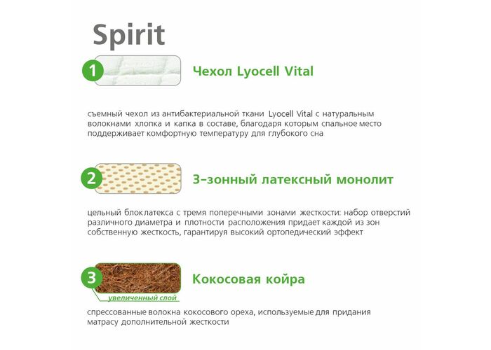 Натуральный материал, получаемый путем вспенивания сока каучукового дерева. Мягкий, гигиеничный и хорошо вентилируемый, он обеспечивает упругую поддержку позвоночнику.
